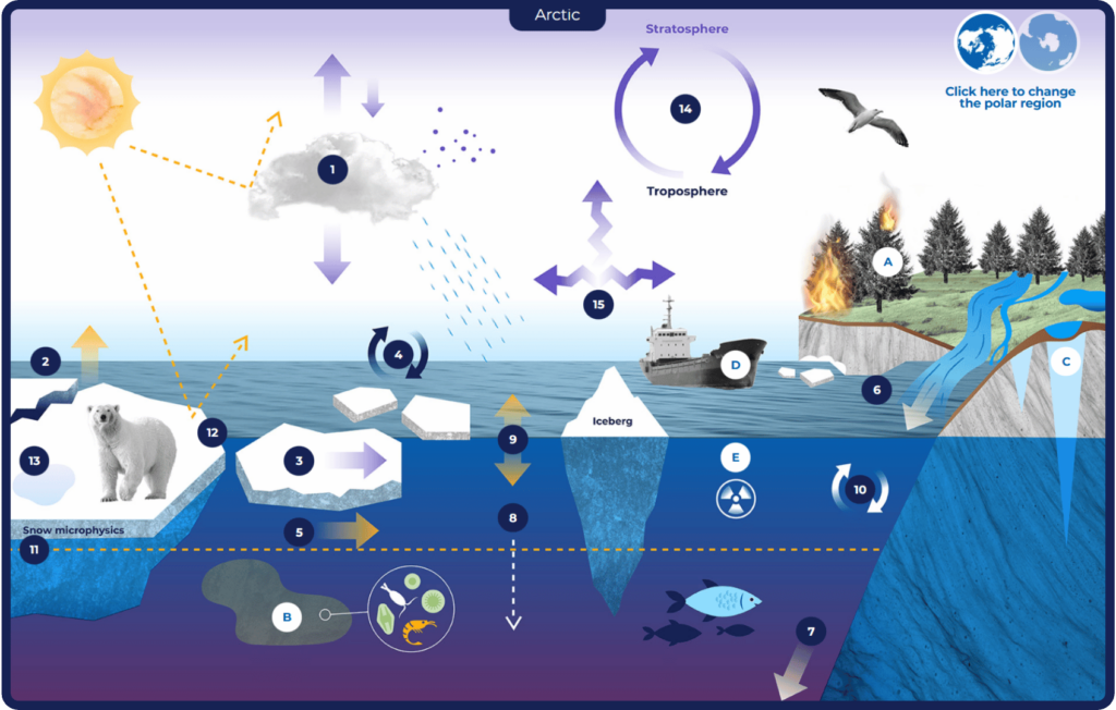 Discover key processes in the atmosphere, ocean and cryosphere. By selecting labelled elements on this infographic, users can access concise explanations.